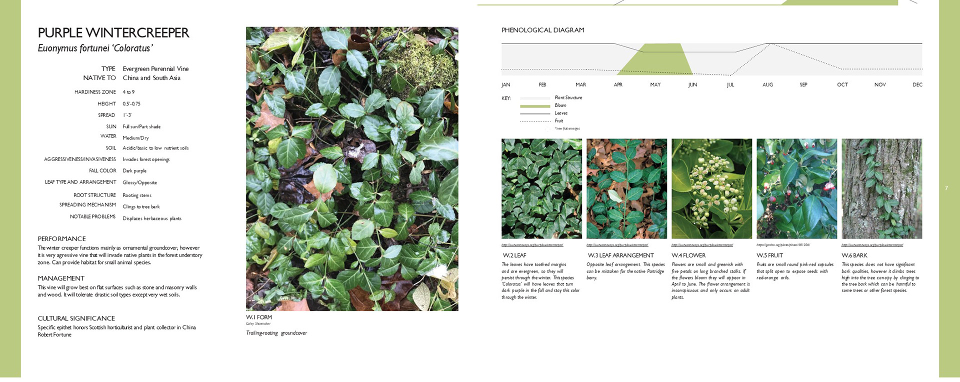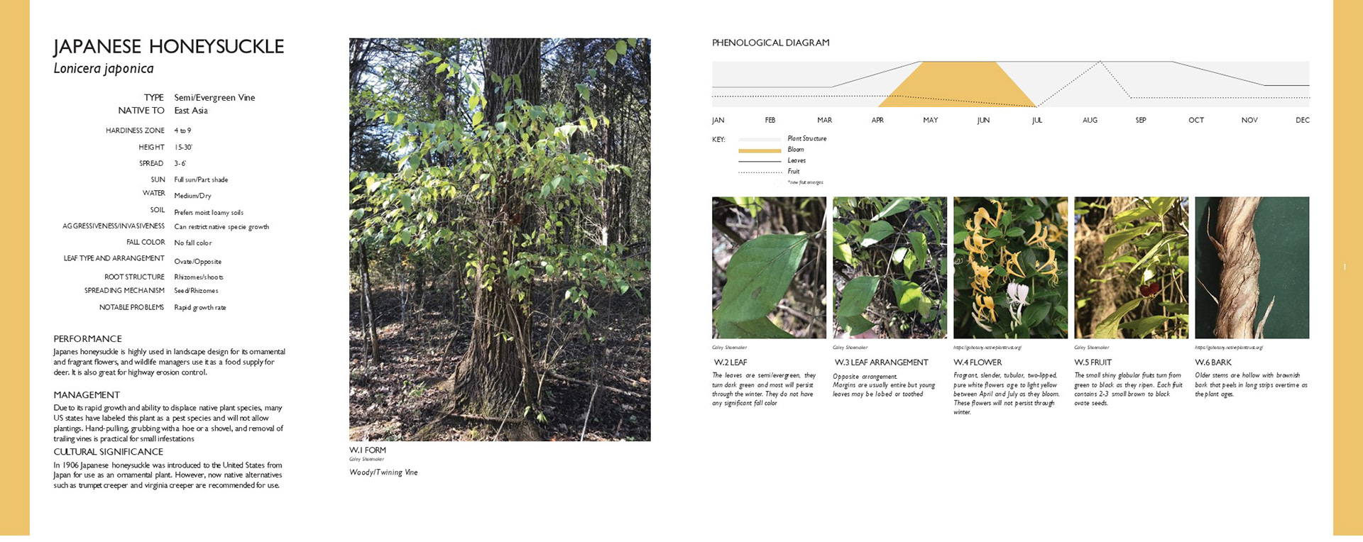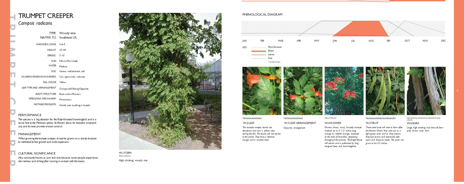 Course Description: This course provides students with an introduction to the use of plant materials in the built environment, drawing upon contemporary approaches to landscape architecture and sustainable landscape design. Practice in these fields increasingly combines ecological and horticultural science with theories of aesthetics to create landscapes that provide ecosystem services in addition to aesthetic value. The course is structured in such a way to provide students with concrete working knowledge - identification and performative characteristics - of approximately 120 plants that are somewhat ubiquitous in the southeast or across the United States with a particular emphasis on plants that are well-adapted to urban situations. In addition to plant identification, the course will provide students with a series of frameworks through which to consider how plants have been or could be utilized, as well as emerging ecological theories such as novel ecosystems.