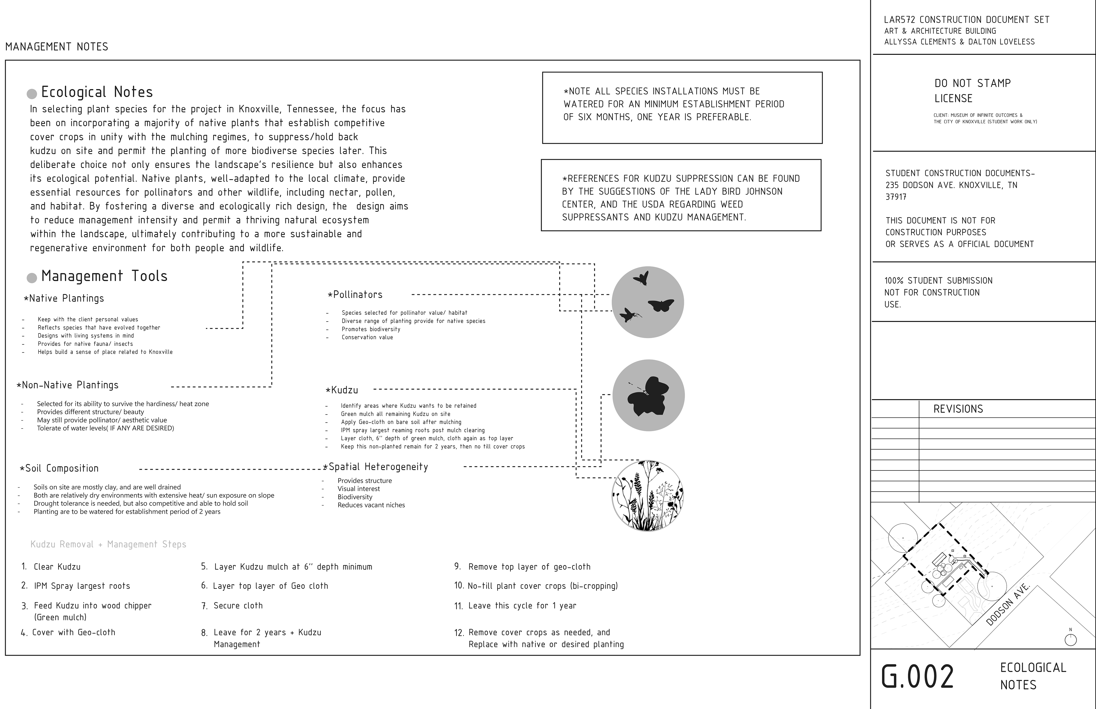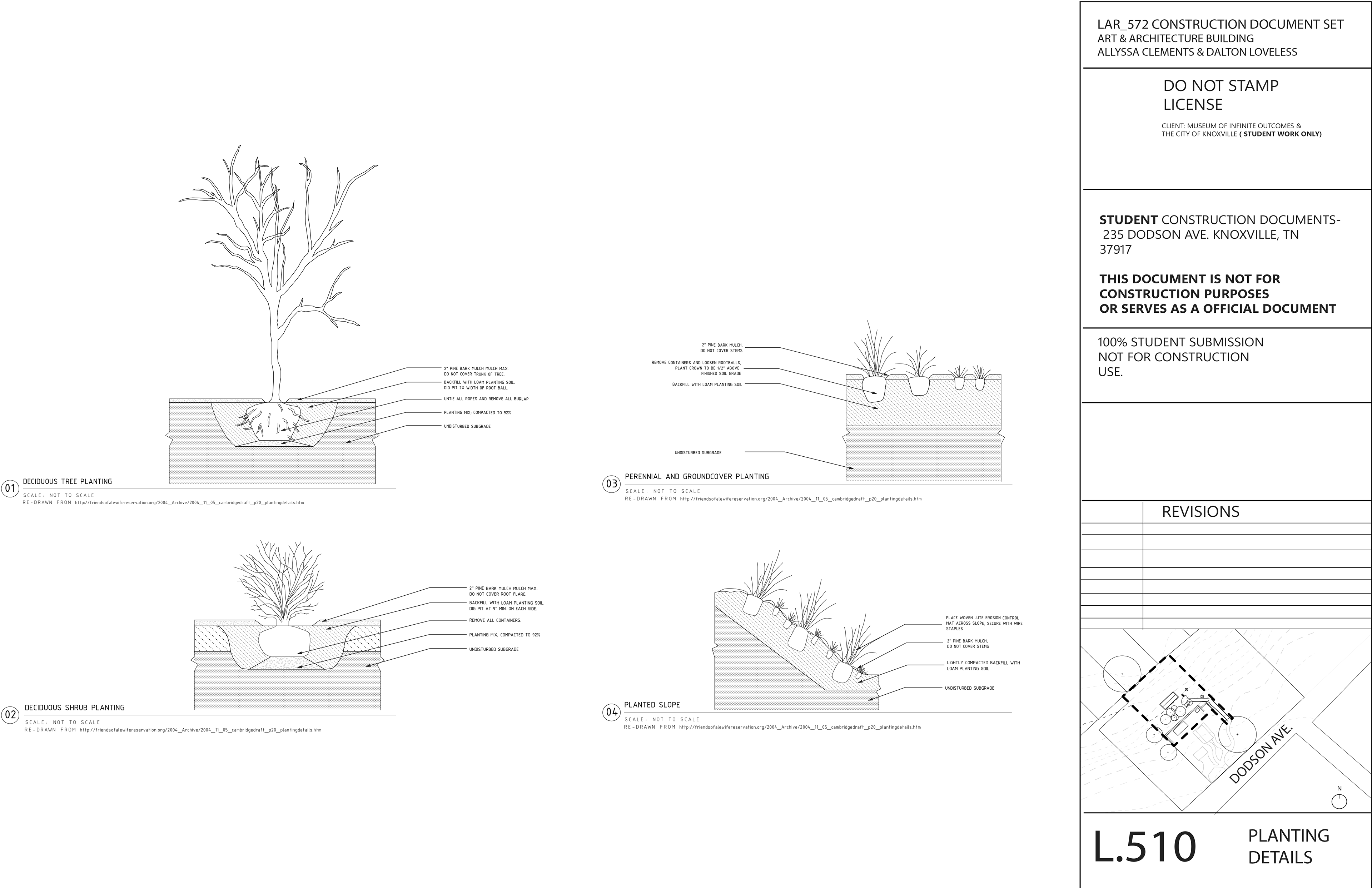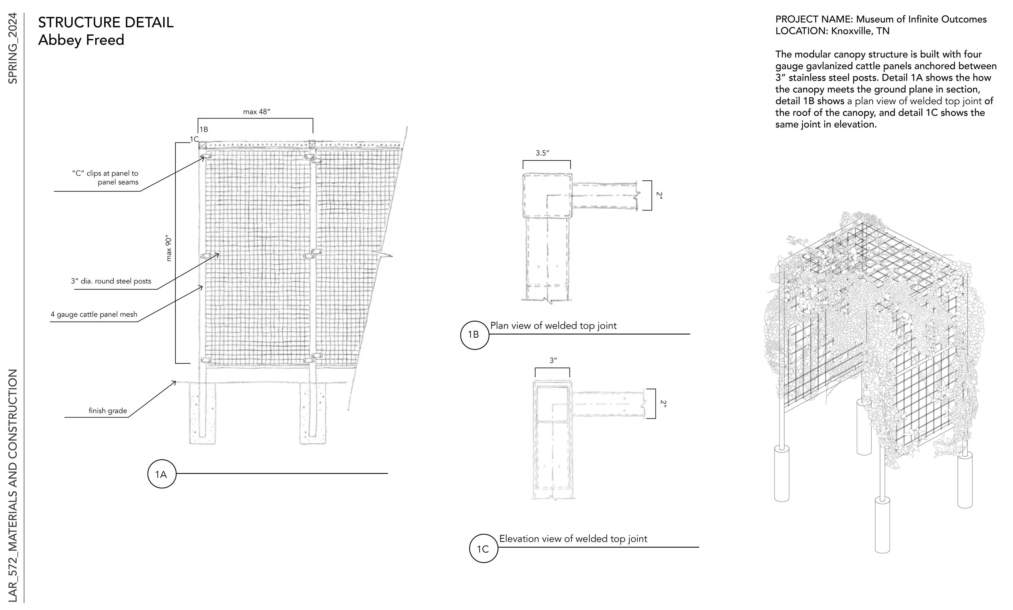 Exercise: The group design exercise focus on the Museum of Infinite Outcomes, a local educational landscape that invites people to engage more deeply, through workshops and gardening, with plants and wildlife. The site consists of the northern sloping portion of the museum, which is currently overtaken by kudzu. Student explored a detail, be it a paver or human-scaled structure, that could engage museum visitors, mitigate the kudzu’s expansion through artful ways, and advance local material sourcing or upcycling. The detail’s deployment and assembly should act as catalyst for wider design interventions, such as paths or gathering spaces. Students will develop a construction documentation set and supplementary visuals to present their work before the museum’s board